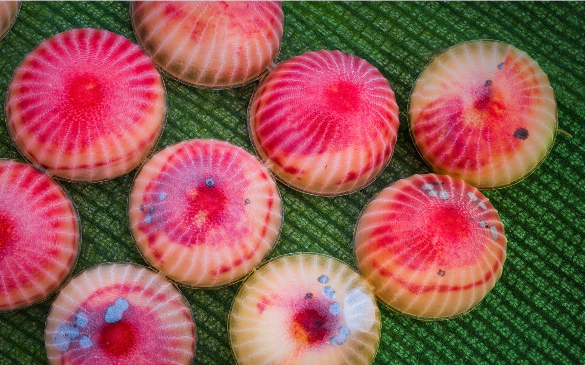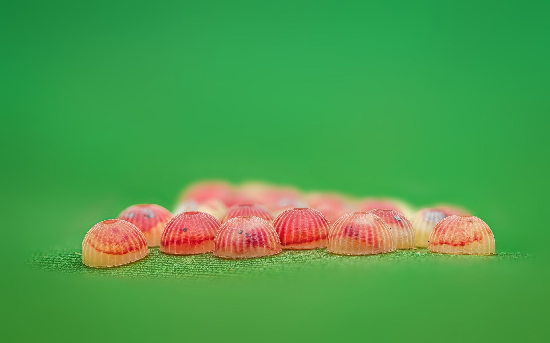 عند رؤية اللقطة لأول مرة، قد يظن المرء أنّه ينظر إلى قطع حلوى ملوّنة تُركت فوق ورقة موز. لكنها في الحقيقة بيوض فراشة، لم تكن آمنة كما تبدو، إذ تربّص بها دبور طفيلي لوضع بيضه داخلها.