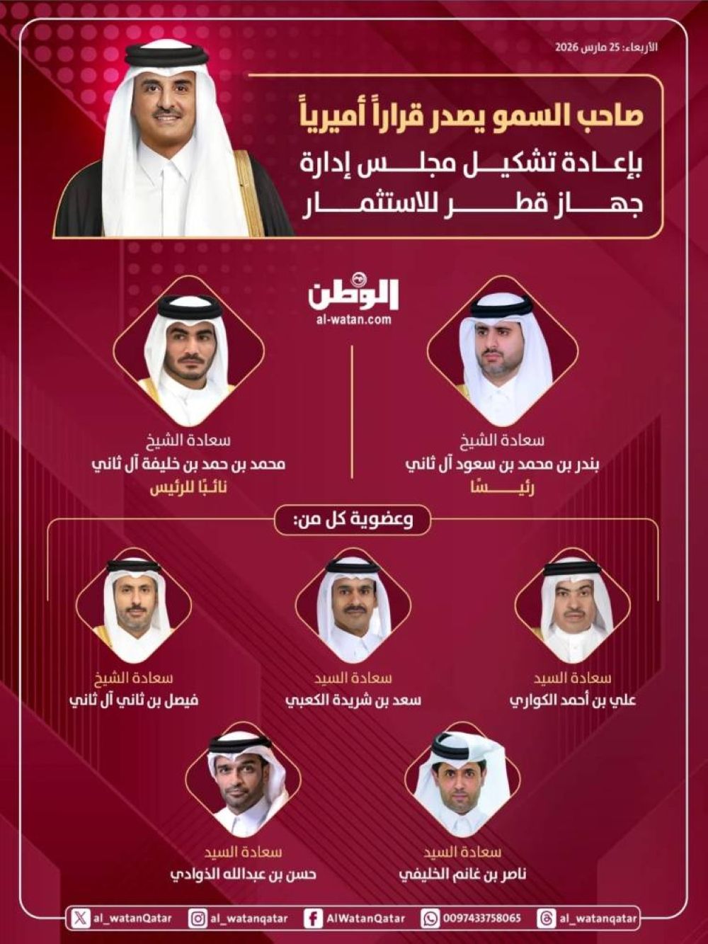 الخميس 26 مارس 2026 04:52 صباحاً حضرة صاحب السمو الشيخ تميم بن حمد آل ثاني أمير البلاد المفدى، يصدر قرارا أميريا بإعادة تشكيل مجلس إدارة جهاز قطر للاستثمار