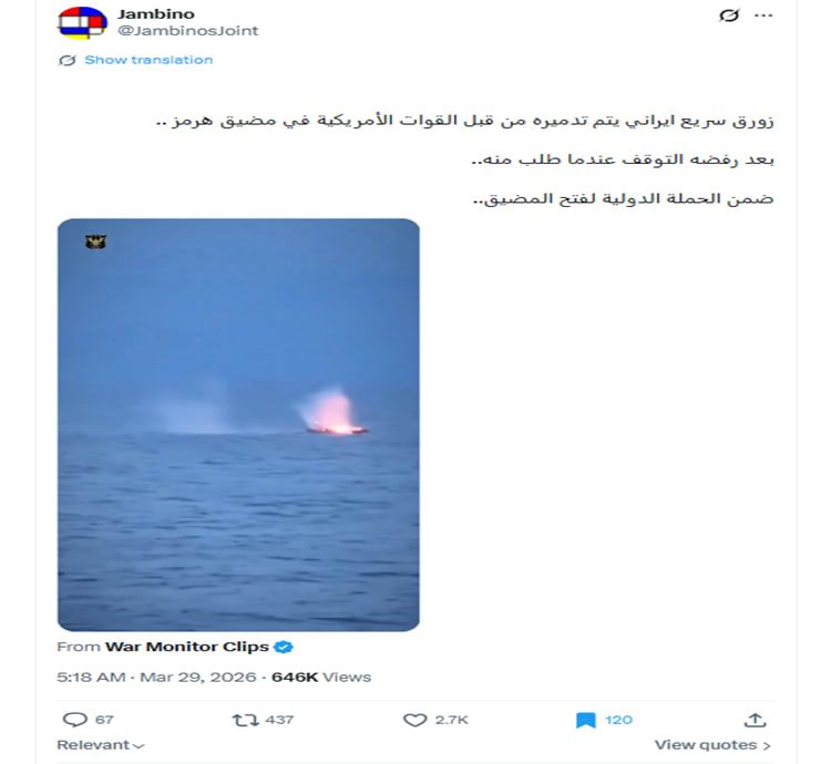 حاز الفيديو حوالي مليون مشاهدة في موقع إكس وحده، مصحوبًا بوصف مُضلل يقول: "زورق سريع إيراني يتم تدميره من قبل القوات الأمريكية في مضيق هرمز بعد رفضه التوقف عندما طلب منه ضمن الحملة الدولية لفتح المضيق".
