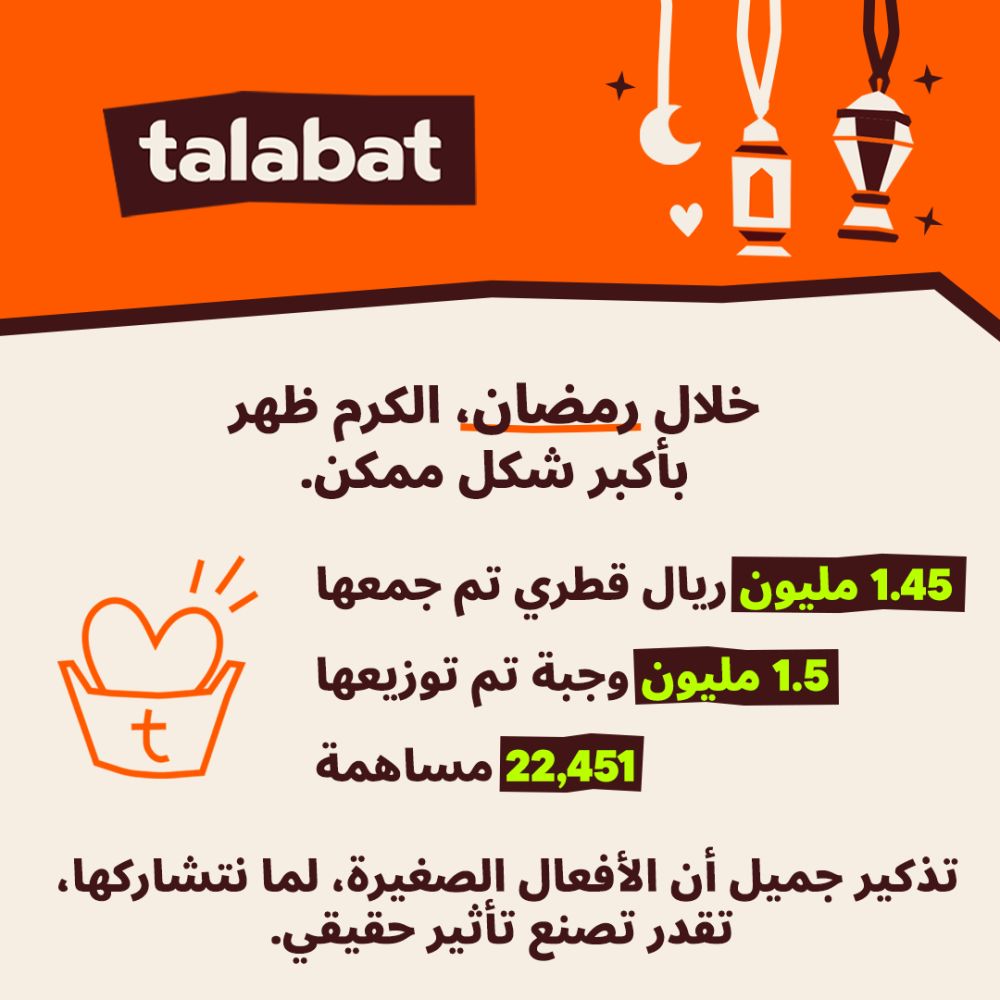 الاثنين 30 مارس 2026 06:16 مساءً أعلنت «طلبات» عن نتائج حملتها الرمضانية لعام 2026 «شارك إفطارًا» في قطر، مسلطةً الضوء على حجم المساهمات المجتمعية التي تمت عبر تطبيقها خلال الشهر الفضيل حيث أثمرت الحملة في قطر عن: توزيع 1.5 مليون وجبة إفطار وجمع تبرعات بقيمة 343,024 يورو (ما يعادل 1.45 مليون ريال قطري) وتسجيل 22,451 مساهمة من 6,074 متبرع أما على مستوى المنطقة، فقد حققت الحملة ما يلي: توزيع أكثر من 24 مليون وجبة وجمع تبرعات بقيمة 1.7 مليون يورو وتسجيل أكثر من 218,000 مساهمة من أكثر من 77,000 متبرع.