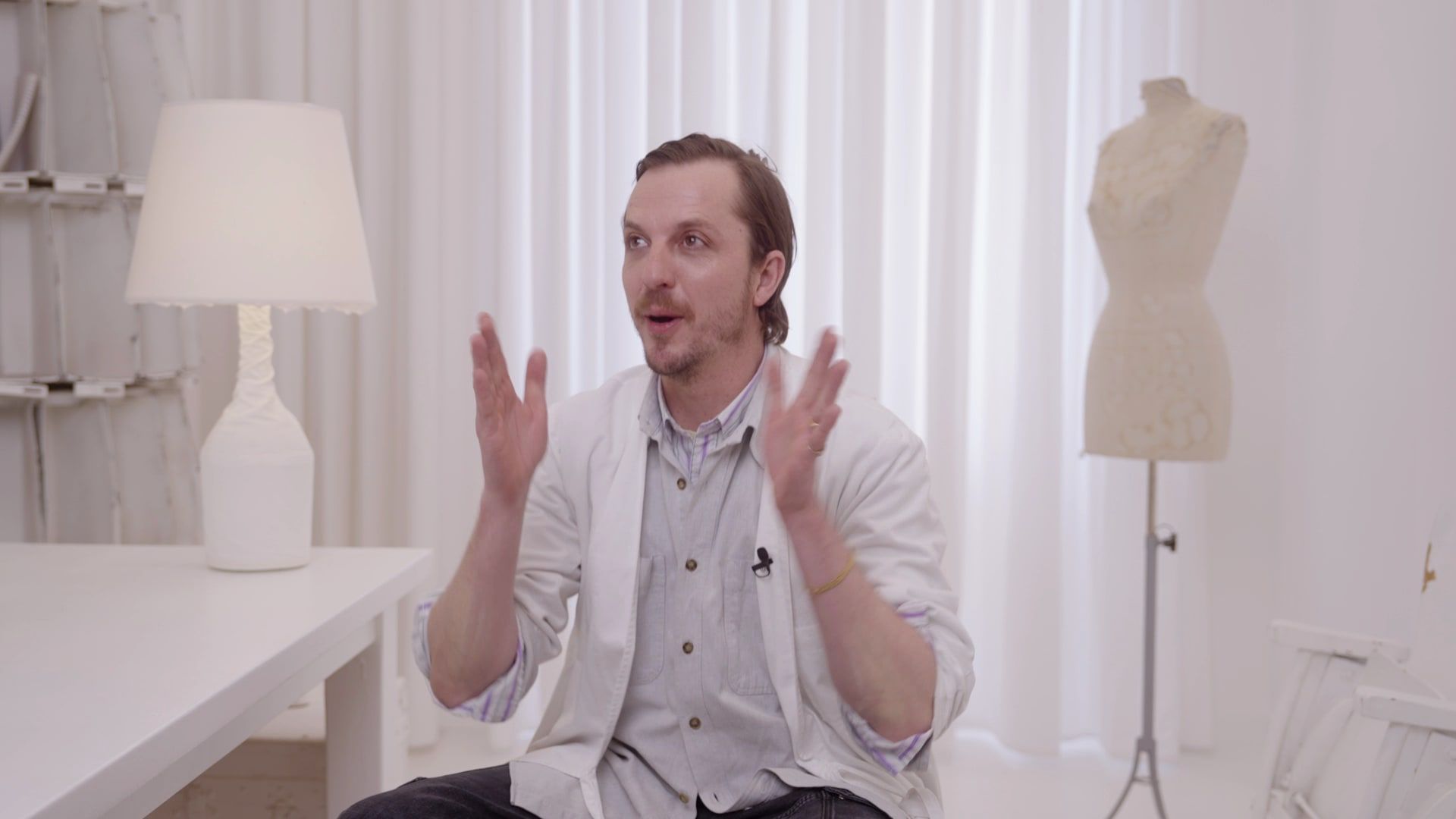 وقال: "الأمر كله يدور حول إعادة الاستخدام، والعمل بأسلوب مختلف، ومحاولة إيجاد بدائل للصناعة"، مثل استخدام قماش من متجر مستعمل عوض مصنع فرنسي حصري، أو تحويل دمية بورسلين إلى فستان بالحجم البشري.