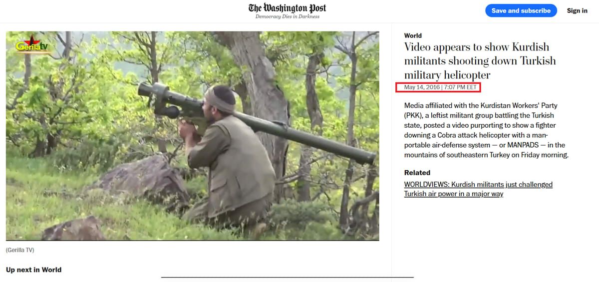 وقتها، أوردت الصحيفة أن وسائل إعلام تابعة لحزب العمال الكردستاني نشرت المقطع زاعمة أنه يُظهر مقاتلاً يُسقط مروحية هجومية من طراز كوبرا باستخدام سلاح دفاع جوي محمول على الكتف في جبال جنوبي شرق تركيا.
