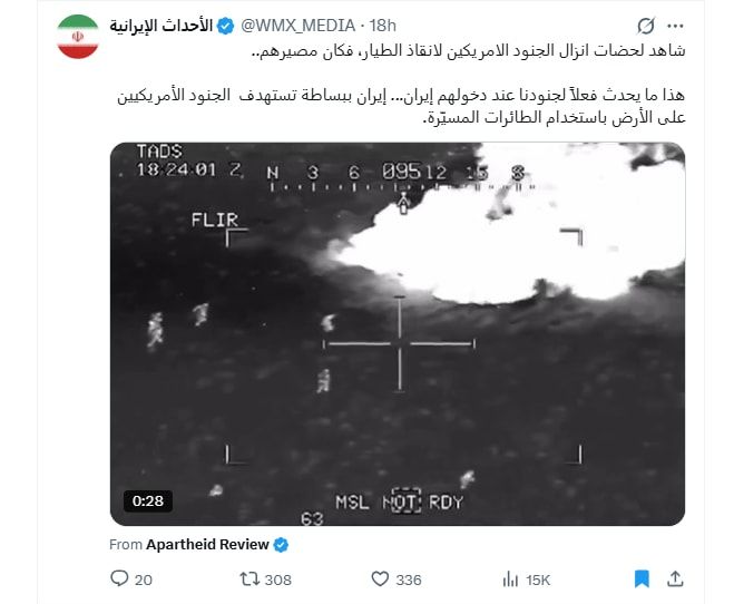 ورافق الادعاء وصف يقول: "شاهد لحظات إنزال الجنود الأمريكيين لإنقاذ الطيار، فكان مصيرهم.. هذا ما يحدث فعلاً لجنودنا عند دخولهم إيران... إيران ببساطة تستهدف الجنود الأمريكيين على الأرض باستخدام الطائرات المسيّرة".