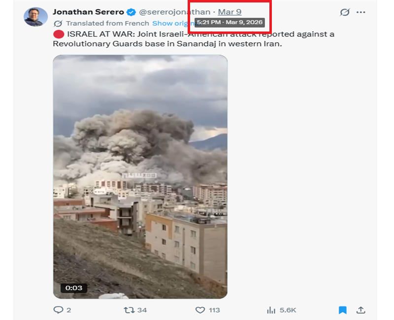 على ذات الوتيرة، أعادت حسابات في منصة إكس استخدام مقطع فيديو يعود إلى الأيام الأولى من الحرب، مع إضافة سياق مغاير لحقيقته. يعرض المقطع لقطات للحظة وقوع ضربات وتصاعد سحب الدخان.