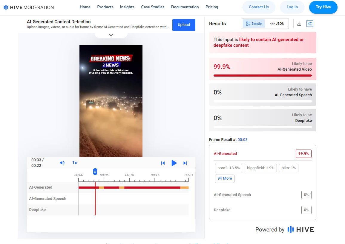 ورجّحت نتائج فحص الفيديو بأداة Hive Moderation، المتخصصة في كشف المواد المُضللة، أن المقطع مُنشأ بالذكاء الاصطناعي بنسبة 99.9%.