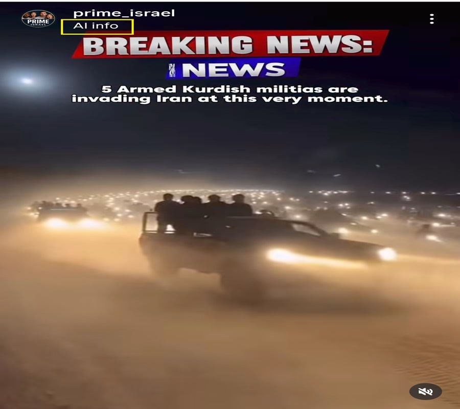 وزعم الوصف المصاحب للفيديو أن "النظام ينهار! اقتحمت الميليشيات الكردية إيران للمساعدة في تحرير البلاد من النظام الشرير والسادي. تقول المصادر إن الأمر انتهى بشكل أساسي - فالآيات الله والقادة يفرون إلى روسيا. هل يجب قتل جميع الإرهابيين في إيران؟"