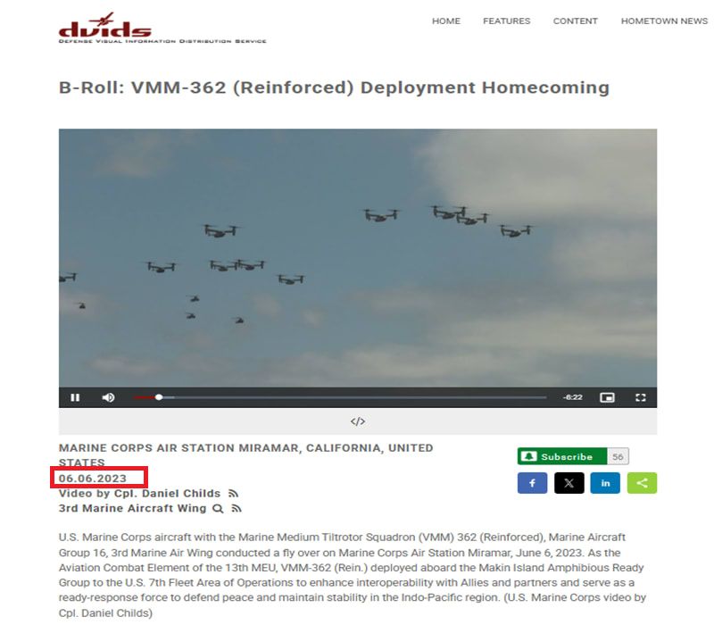 وأسفر استخدام البحث العكسي عن العثور على منشور يحتوي الفيديو، على موقع "خدمة توزيع المعلومات المرئية الدفاعية الأمريكية" (DVIDS)، بتاريخ 6 يونيو/حزيران 2023. وأشار الموقع إلى أن اللقطات تعود إلى أن "عودة سرب VMM-362 (المعزز) من مهمة الانتشار".