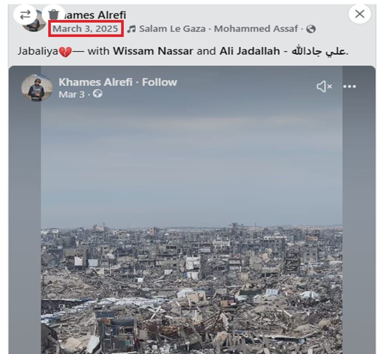 ونشر المصور خميس الريفي الفيديو في صفحته عبر فيسبوك في 3 مارس/آذار 2025، وكتب مُعلقًا: "جباليا".