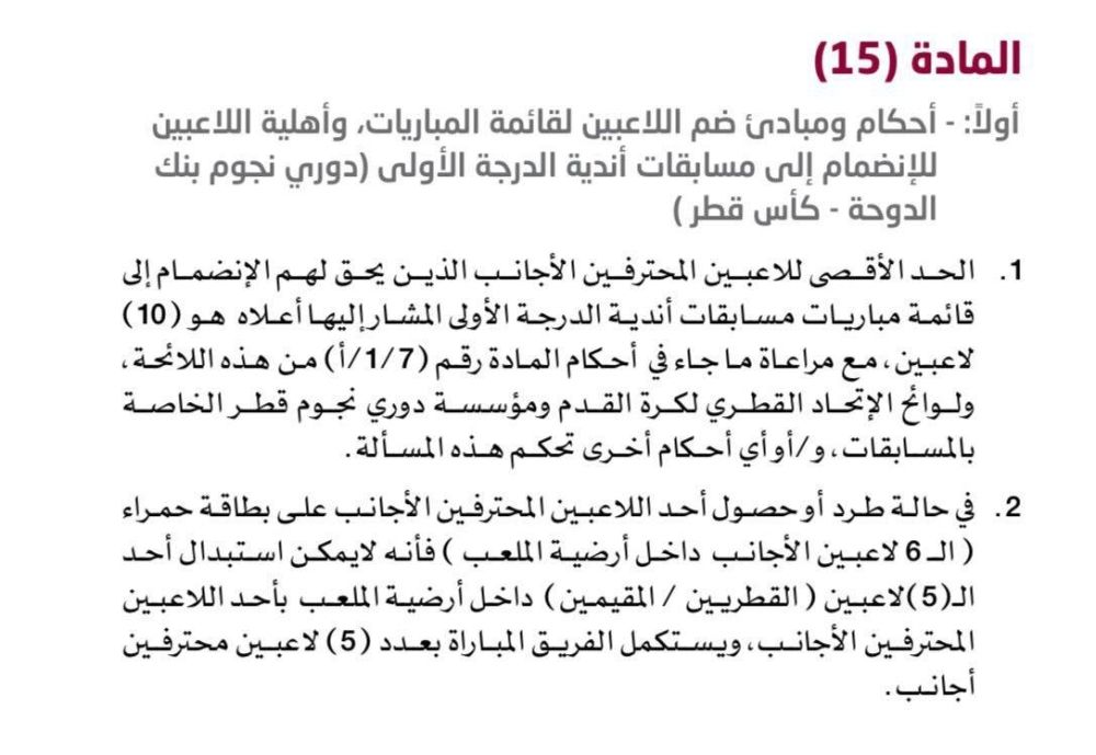 الاثنين 13 أبريل 2026 06:40 مساءً تقدم نادي الشمال باحتجاج رسمي إلى اتحاد الكرة، اعتراضًا على ما اعتبره مخالفة إدارية من نادي قطر، وذلك على خلفية إشراك اللاعب الأرجنتيني فرانكو روسو خلال المواجهة التي جمعت الفريقين مساء أمس الإثنين على استاد البيت، ضمن المباراة المؤجلة من الجولة السابعة عشرة لدوري نجوم بنك الدوحة للموسم 2025-2026، والتي انتهت بفوز قطر بهدفين دون رد.
