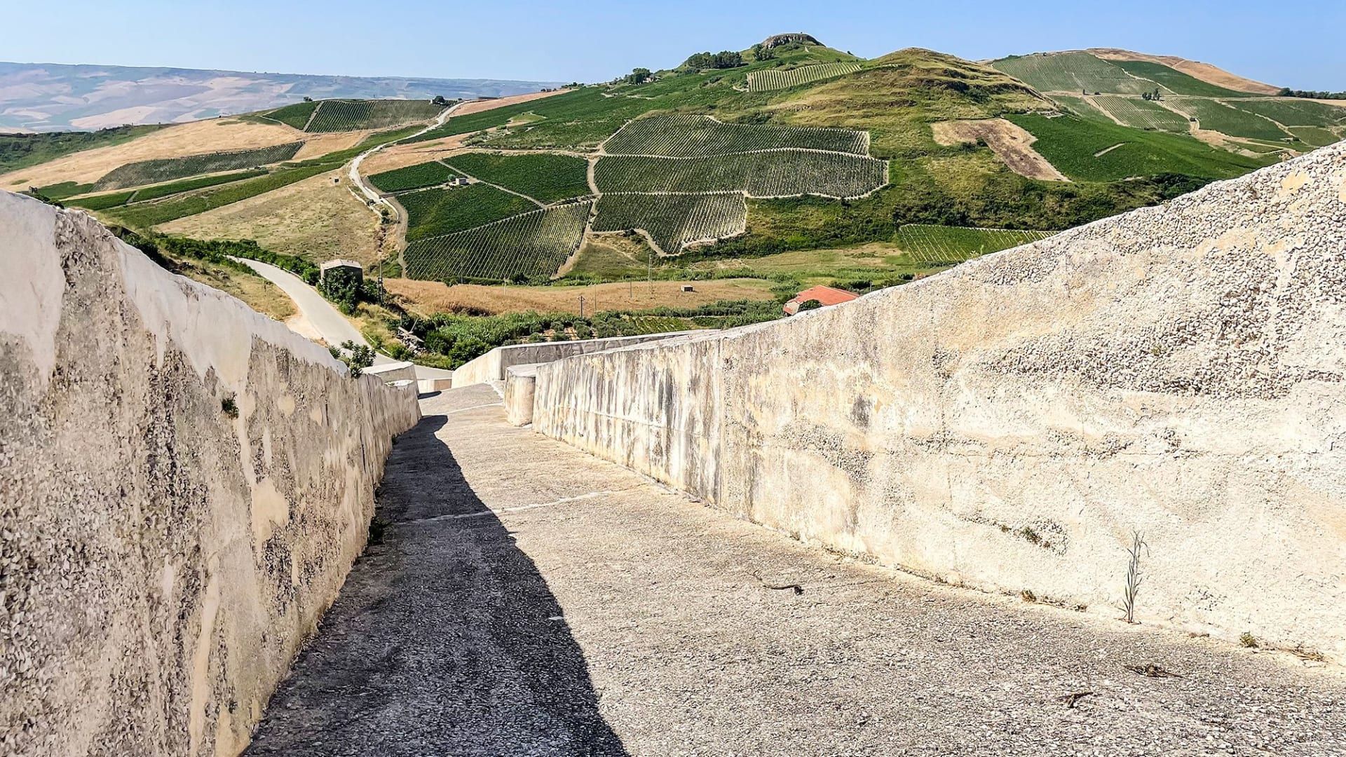 لكن في أقصى غرب أكبر جزر البحر الأبيض المتوسط، وبين تضاريس وادي "بيليتشي"، ترتفع على أحد سفحين أعمدة وجدران قد تبدو من بعيد كبقايا يونانية أو رومانية، لكنها تكشف عند الاقتراب منها عن أطلال مبانٍ أحدث عهدًا، بينما يغمر سفحًا مجاورًا لون الخرسانة.