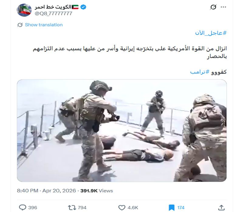 اخبار العرب -كندا 24: الثلاثاء 21 أبريل 2026 11:27 صباحاً دبي، الإمارات العربية المتحدة (CNN)-- تناقلت حسابات مقطع فيديو في وسائل التواصل الاجتماعي، بزعم أنه يعرض مشاهد للحظة إنزال أمريكي على سفينة إيرانية.