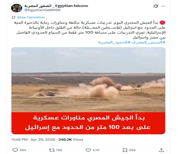 حصدت اللقطات مئات الآلاف من المشاهدات في منصتي إكس وفيسبوك، مصحوبة بتعليقات مُضللة بعضها يقول: "بدأ الجيش المصري اليوم تدريبات عسكرية مكثفة ومناورات رماية بالذخيرة الحية على الحدود مع اسرائيل (فلسـطين المحتلة)، حالة من القلق داخل الأوساط الإسرائيلية، تُجرى التدريبات على مسافة 100 متر فقط من السياج الحدودي الفاصل بين مصر وإسرائيل".