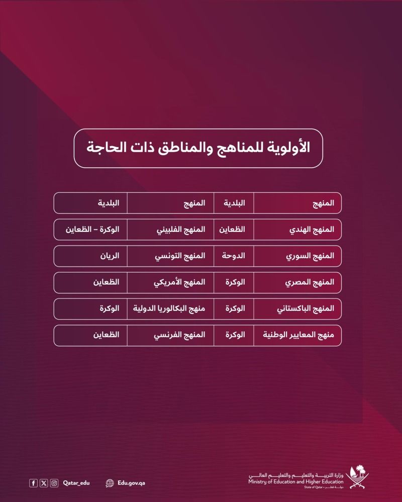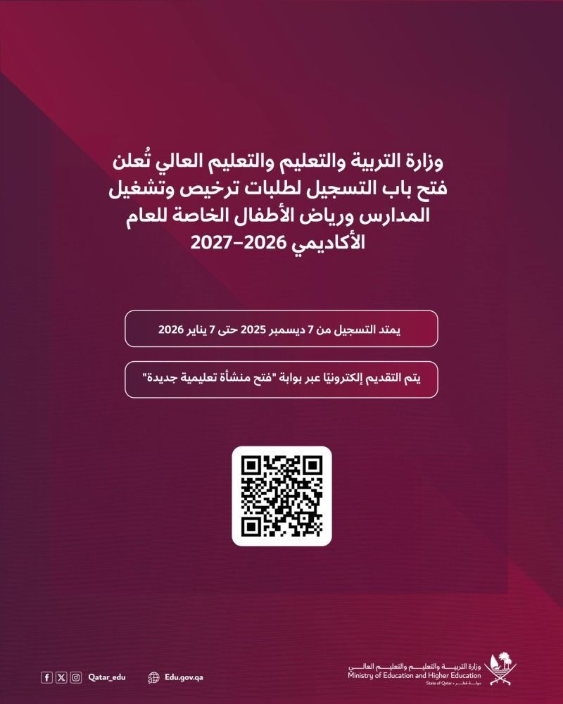 وتكون عملية استقبال الطلبات إلكترونياً على موقع وزارة التربية والتعليم عبر بوابة "فتح منشأة تعليمية جديدة" على الرابط: https://edulicenses.edu.gov.qa، بشروط ومتطلبات خاصة بالمالك والمبنى المدرسي والجانب الأكاديمي، وفقاً لدليل شروط وإجراءات منح تراخيص المدارس الخاصة.