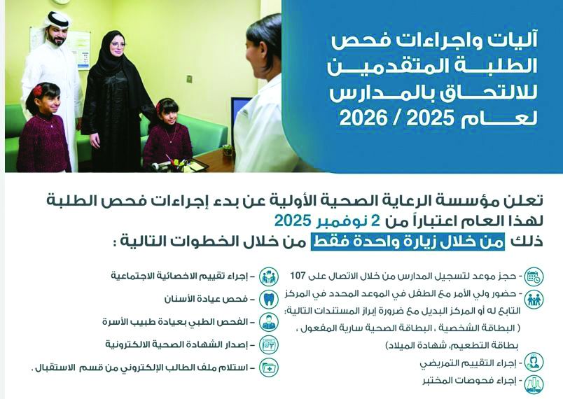 ويقوم ولي الأمر بعد انتهاء جميع الخطوات باستلام ملف الطالب الإلكتروني من مكتب الاستقبال لتقديمه إلى الجهات المختصة. كما أكدت المؤسسة وجود ربط إلكتروني كامل مع وزارة التربية والتعليم والتعليم العالي، يمكّن الجهات المعنية من الاطلاع مباشرة على نتائج الفحص الطبي للطلبة دون الحاجة لمراجعات إضافية. وأشادت مؤسسة الرعاية الصحية الأولية بالتعاون المستمر مع وزارة التعليم وبالجهود المشتركة لتسهيل إجراءات تسجيل الطلبة وضمان جاهزيتهم الصحية لعامهم الدراسي الجديد.
