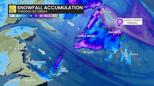 Persistent sea-effect snow in western Newfoundland could produce accumulations of 10-20 cm. A stalling band of heavy snow paired with strong winds will impact Bonavista North and Bay of Exploits, where 15-20 cm is expected under a winter storm warning. Central and eastern areas, including the Avalon, could see spotty accumulations of 5-15 cm, but primarily rain and gusty winds.