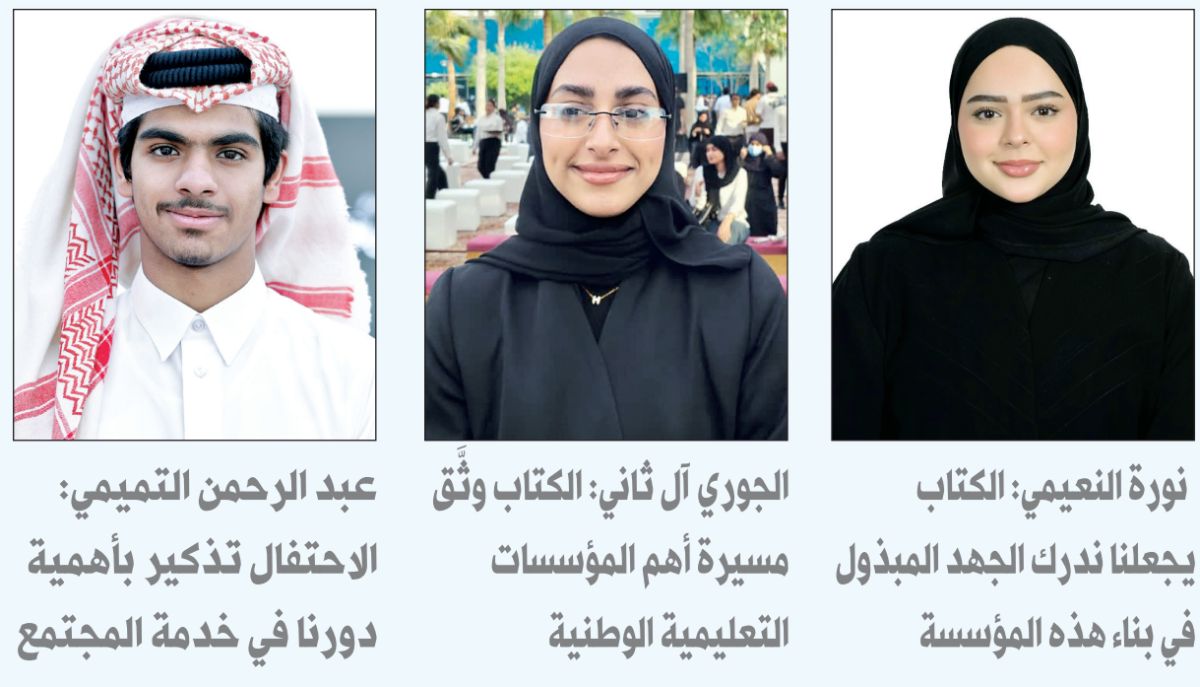من جانبها أكدت الطالبة الجوري عبد العزيز آل ثاني، أن احتفالات اليوم الوطني داخل الجامعة هذا العام حملت طابعًا مختلفًا بفضل الإعلان عن كتاب قصة نجاح، الذي وثّق مسيرة الجامعة منذ بداياتها وحتى أصبحت أحد أهم المؤسسات التعليمية الوطنية، لافتة إلى أن هذا التوثيق يمنح الطلبة نظرة واضحة حول كيفية تطور الجامعة، ويعزز لديهم شعور الفخر بكونهم جزءًا من هذه الرحلة.