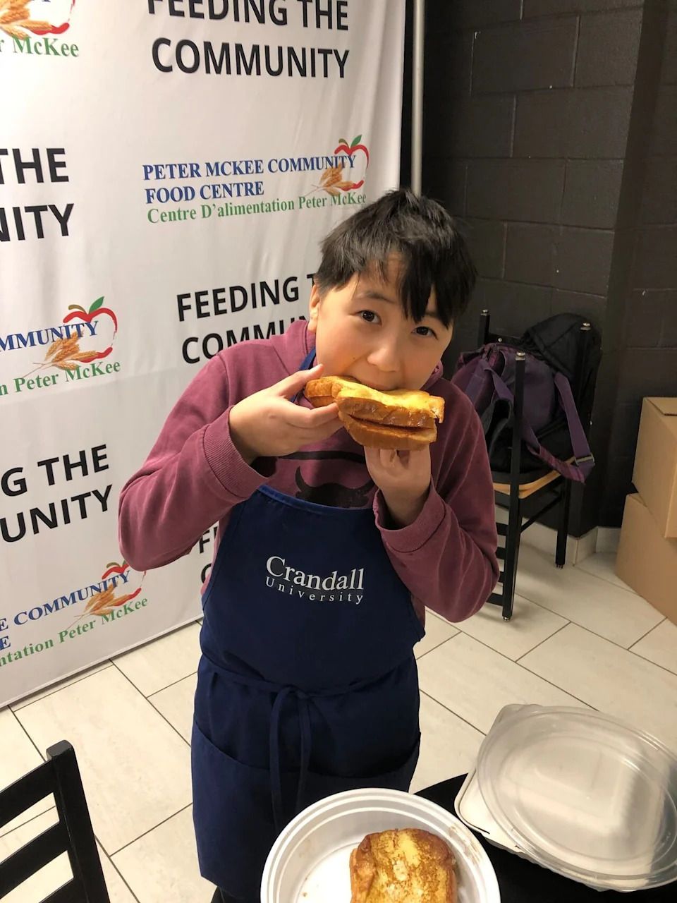 Jet Forbes enjoys the peanut butter and jelly french toast he made at the junior chef academy. (Erica Butler/CBC)