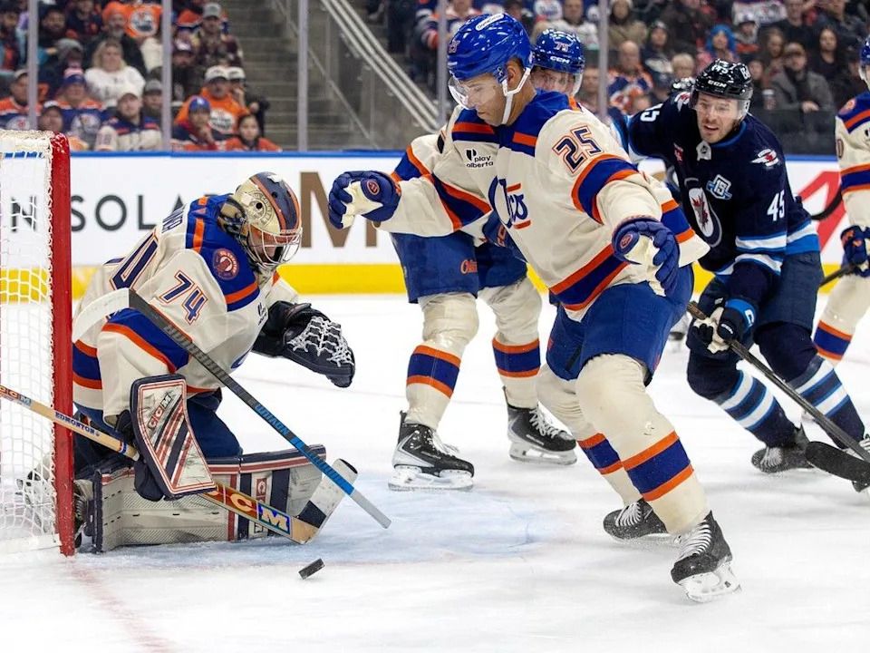 The Edmonton Oilers’ goalie Stuart Skinner (74) and Darnell Nurse (25) stop a Winnipeg Jets’ shot during second period NHL action at Rogers Place, in Edmonton Saturday Dec. 6, 2025.