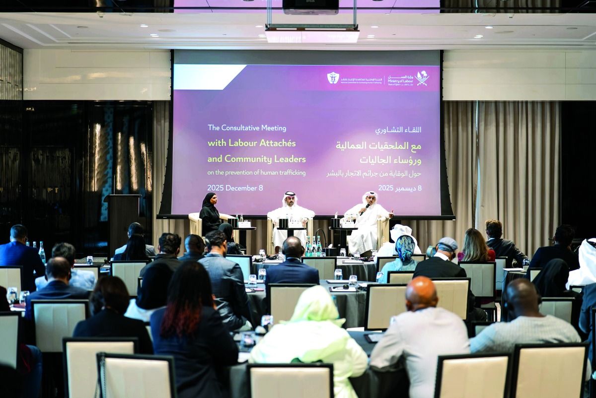 نظّمت وزارة العمل، ممثلةً في اللجنة الوطنية لمكافحة الاتجار بالبشر، أمس، لقاءً تشاورياً موسعاً جمع عدداً من الملحقيات العمالية ورؤساء الجاليات، بهدف تعزيز الشراكة مع الجهات الدبلوماسية والقنصلية وممثلي الجاليات، ودعم جهود الدولة المتعلقة بالوقاية من جرائم الاتجار بالبشر ورفع مستوى الوعي لدى العمال حيالها.