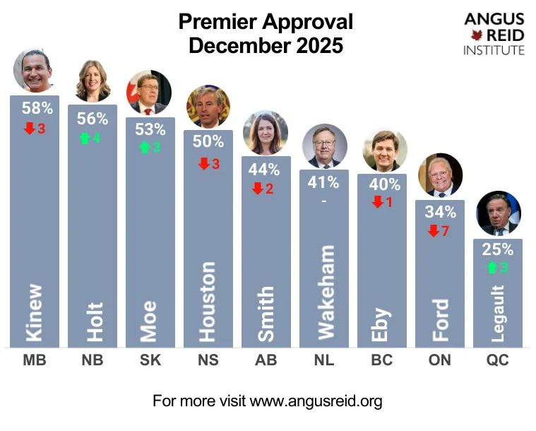 Here’s the Angus Reid Institute’s December tally of premier popularity. As is typical, the average Canadian premier has more constituents who dislike them than like them. Probably the most notable entry on this chart is Newfoundland and Labrador’s Tony Wakeham, who just became premier after his Progressive Conservatives took power with a majority government in October. Usually, as is the case with relative newcomers Wab Kinew and Susan Holt, new premiers have at least a few months of popularity before ultimately dropping into the abyss of net disapproval.