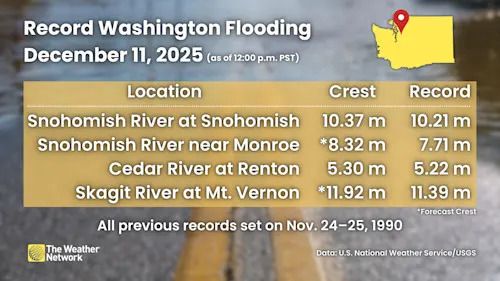 At least four gauges on the Snohomish, Cedar, and Skagit Rivers will end the week having beaten their all-time record crests, with the Skagit River at Mt. Vernon set to surpass its previous record by more than half of a metre.