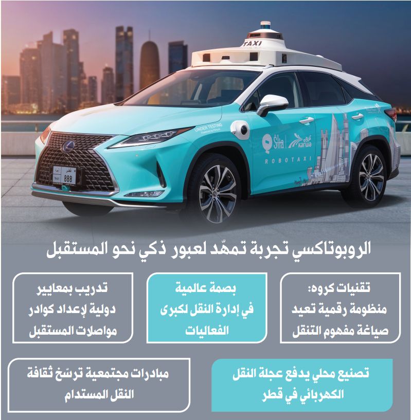 تواصل شركة مواصلات (كروه) ريادتها في مجال النقل الذكي عبر مشروع «الروبوتاكسي»، الذي يمثل إنجازاًنوعياً في مسيرة التحول نحو منظومة نقل مستدامة وذكية في قطر. وقد شهد العام 2025 تقدماً ملموساً في المشروع، حيث تم إجراء تشغيل تجريبي في مناطق رئيسية مثل مطار حمد الدولي ووسط الدوحة والخليج الغربي، إلى جانب إتمام خرائط رقمية عالية الدقة لعدد من المناطق الحيوية.