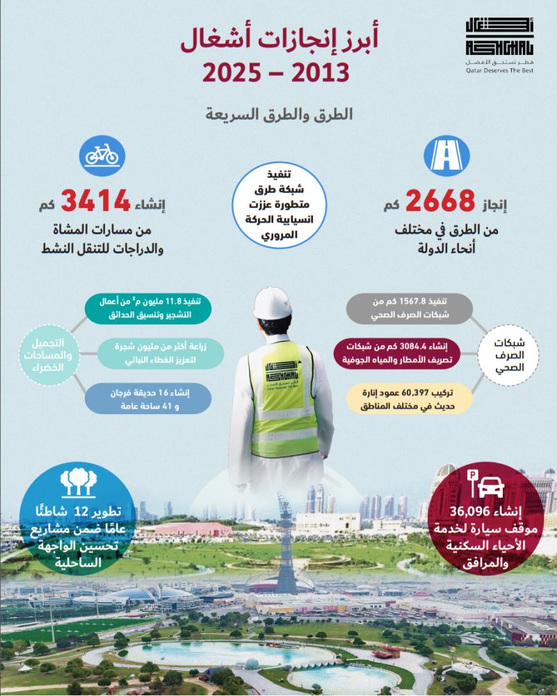 أثبتت هيئة الأشغال العامة "أشغال" قدرتها على قيادة واحدة من أكبر عمليات تطوير البنية التحتية في تاريخ دولة قطر، مُحدثة نقلة نوعية في شبكات الطرق والطرق السريعة والصرف الصحي والمباني العامة والمساحات الخضراء ومنظومة النقل المستدام. وقد استطاعت الهيئة، خلال الفترة من عام 2013 حتى الربع الثاني من 2025، تنفيذ بنية تحتية متطورة وشبكة طرق عززت قطاع المواصلات والنقل في مختلف أنحاء الدولة، وذلك في إطار خطط استراتيجية مدروسة تتماشى مع رؤية قطر الوطنية 2030. وأشادت "أشغال" بالدور المحوري للتعاون مع الجهات الحكومية، وفي مقدمتها وزارة المواصلات، إلى جانب المؤسسات الخاصة، في تحقيق هذه الإنجازات. وتواصل الهيئة اليوم المضي بثبات نحو مرحلة تنموية جديدة تعتمد على الابتكار والكفاءة