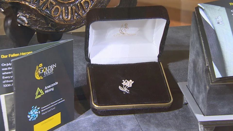 In 2016, The Golden Tulip and Anaconda Mining worked together to produce forget-me-not pins in honour of Beaumont-Hamel. All proceeds went to help veterans in need. (Mark Cumby/CBC)