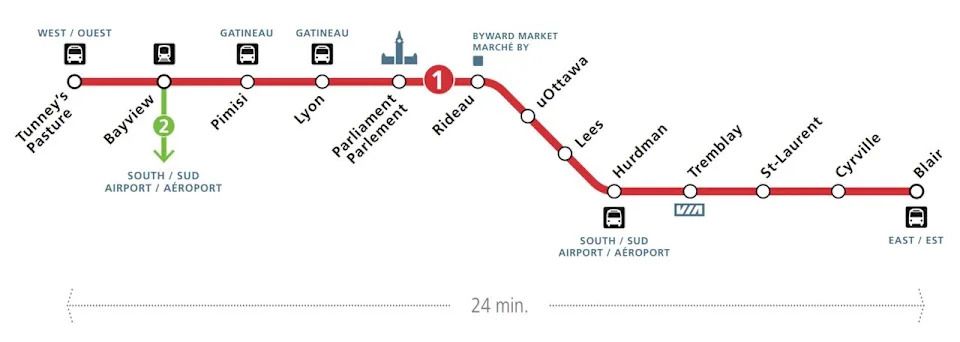 Around 8 a.m. Sunday, the transit agency posted online that trains were not running along that stretch and that R1 replacement bus service was taking riders between Tunney's Pasture and Hurdman stations.