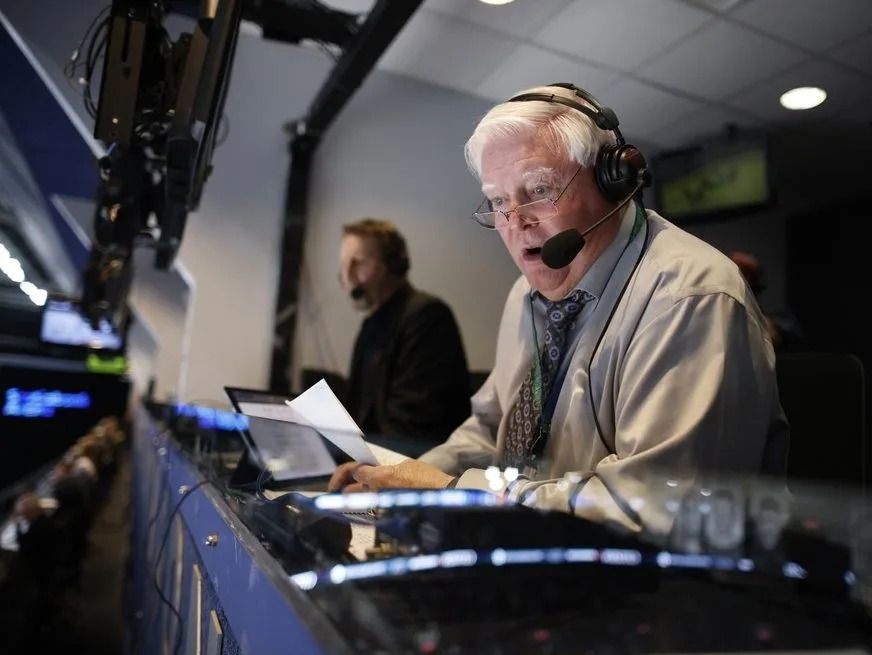 Toronto Maple Leafs broadcaster Joe Bowen calls an NHL game between the Toronto Maple Leafs and Ottawa Senators in Toronto, Monday, Sept. 25, 2023.