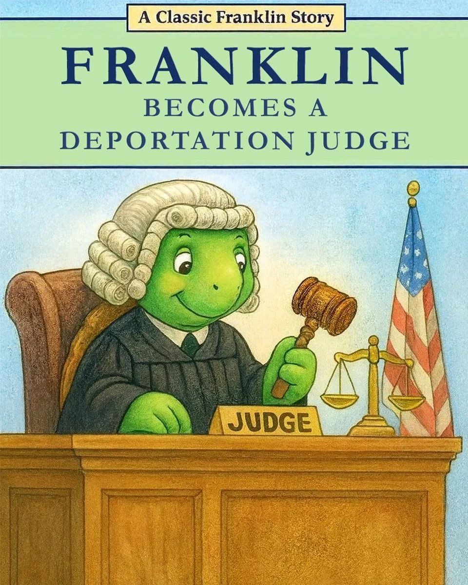 This is a recent social media post put out by the U.S. Department of Justice seeking deportation judges. This actually marks the second time that a U.S. federal agency has issued a meme based on the Canadian children’s book character Franklin (the first being a social media post by U.S. Secretary of War Pete Hegseth). According to commentator David Frum, this all might be a violation of copyright law.
