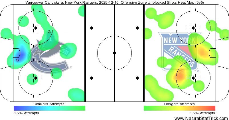 The shot “heat” map of the Canucks vs. Rangers game on Tuesday, showing where they got their shots from and how often. We can see that neither team was especially threatening at 5 v 5.
