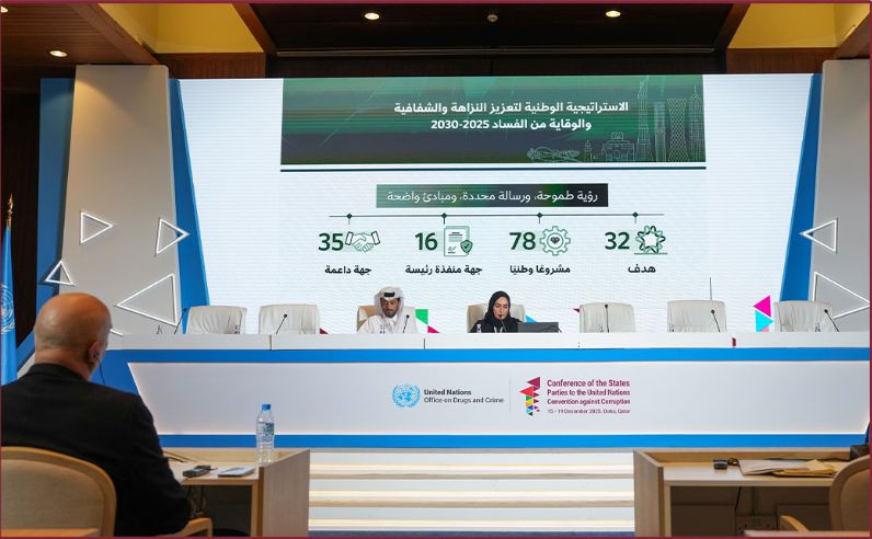 استعرضت دولة قطر الاستراتيجية الوطنية لتعزيز النزاهة والشفافية والوقاية من الفساد "2025 – 2030"، خلال جلسة جانبية ضمن أعمال الدورة الحادية عشرة لمؤتمر الدول الأطراف في اتفاقية الأمم المتحدة لمكافحة الفساد (COSP11)، المنعقدة حاليا في الدوحة.