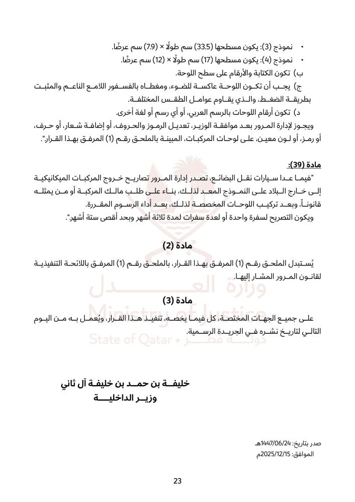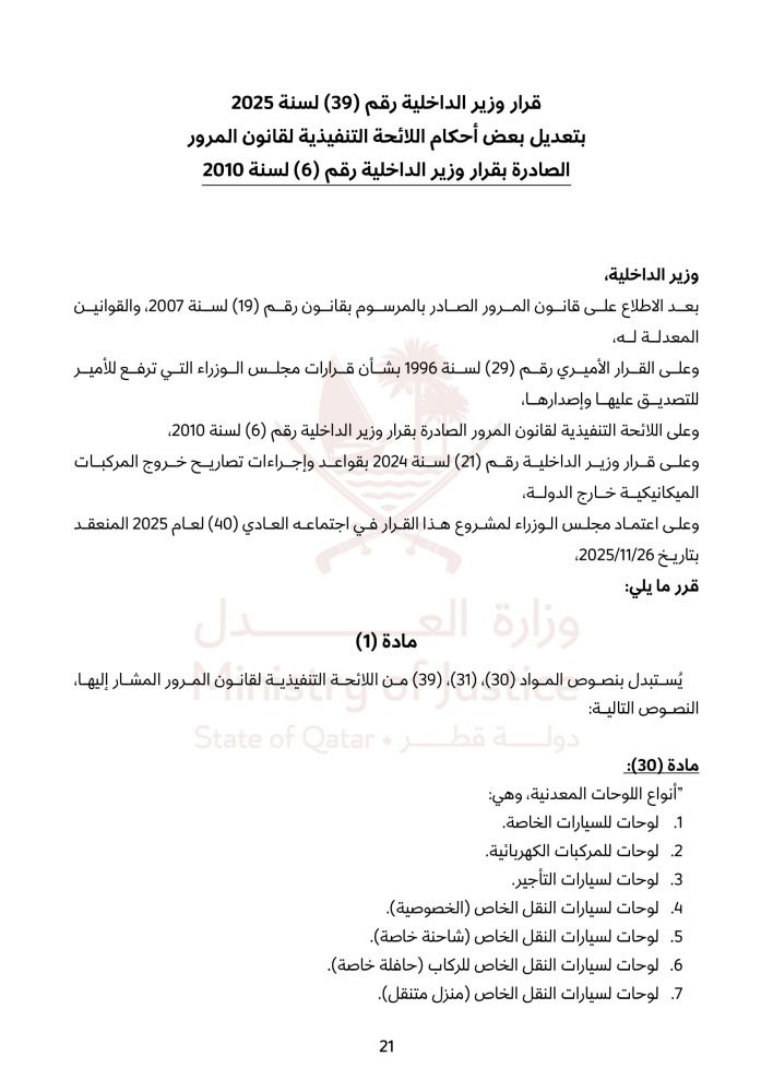 نشرت الجريدة الرسمية في عددها رقم 29 الصادر اليوم 17 ديسمبر 2025، قرار وزير الداخلية رقم (39) لسنة 2025 بتعديل بعض أحكام اللائحة التنفيذية لقانون المرور الصادرة بقرار وزير الداخلية رقم (6) لسنة 2010.