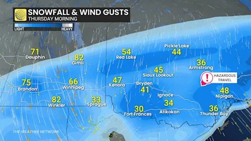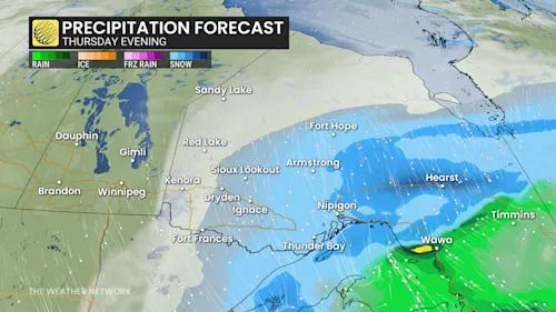 By Wednesday evening, snow will move into northwestern Ontario, with heavy snow starting in the Kenora and Dryden area. Overnight into Thursday, snowfall intensifies from Thunder Bay to Kapuskasing, with rates of 2 cm per hour expected.