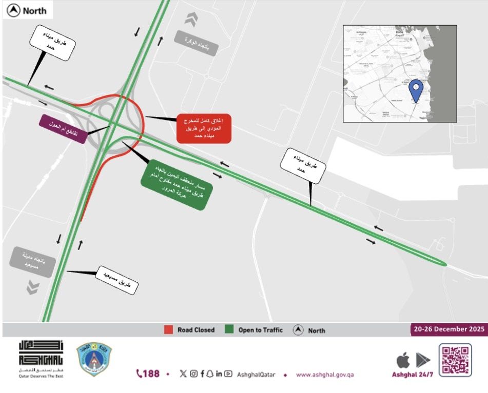 أعلنت هيئة الأشغال العامة "أشغال"، عن إغلاق مؤقت وكامل لمخرج تقاطع أم الحول أمام القادمين من طريق مسيعيد باتجاه طريق ميناء حمد، وذلك اعتبارا من الساعة الثانية فجر السبت 20 ديسمبر الجاري وحتى الساعة الخامسة فجر الجمعة 26 ديسمبر الجاري، بهدف استكمال أعمال الصيانة.