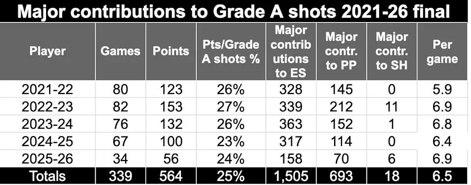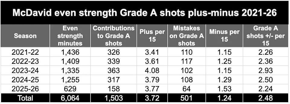 So far this year McDavid is averaging 6.9 major contributions to Grade A shots per game, the same amount as he did in his peak scoring year of 2022-23 when he was also in on 6.9 per game.