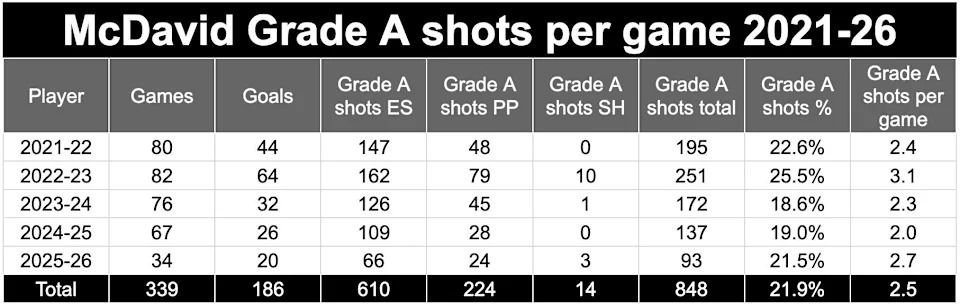 McDavid has connected on 2.7 Grade A shots per game. The only time he’s had more Grade A shots on net per game was in 2022-23 when he scored 64 goals. As mentioned, he’s now on track for 48 goals this year.