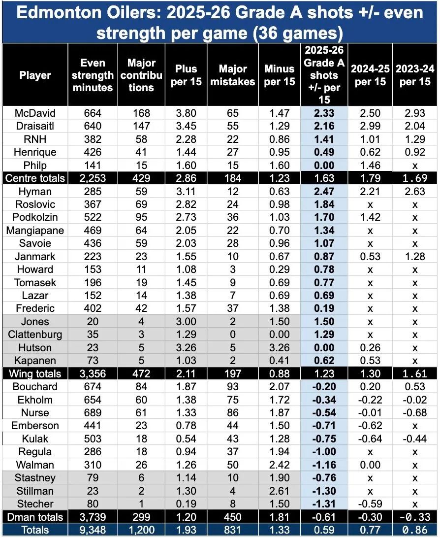 4. In terms of his defensive play, no winger on the Oilers is leaking Grade A shots against like Frederic. Not even close. He’s making 1.38 major mistakes per 15 minutes of even strength play. The team average for wingers 0.88 per 15.