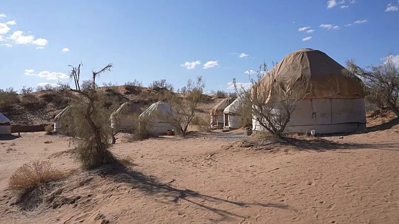 A cluster of traditional yurts set against the sandy landscape of the Kyzylkum desert in Uzbekistan - Euronews