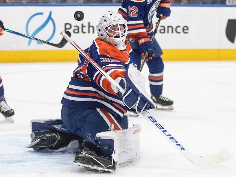 Edmonton Oilers goaltender Connor Ingram makes the save against the Vegas Golden Knights during first period NHL action, in Edmonton on Sunday, Dec. 21, 2025.