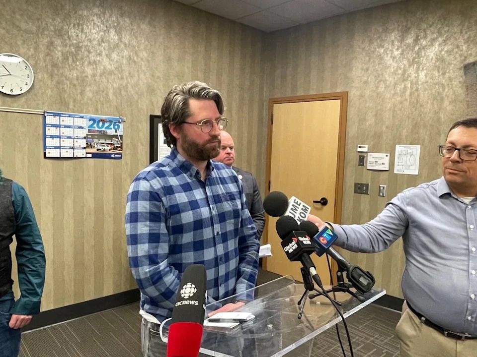 Ian Cantello, president of the Regina Civic Middle Management Association, speaks with reporters earlier this month. (Chris Edwards/CBC)