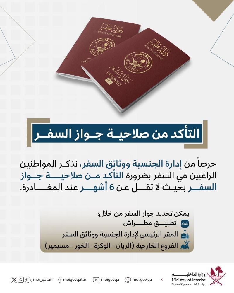 جددت وزارة الداخلية التأكيد على أهمية التحقق من صلاحية جواز السفر للمواطنين، بحيث لا تقل عن 6 أشهر عند المغادرة.