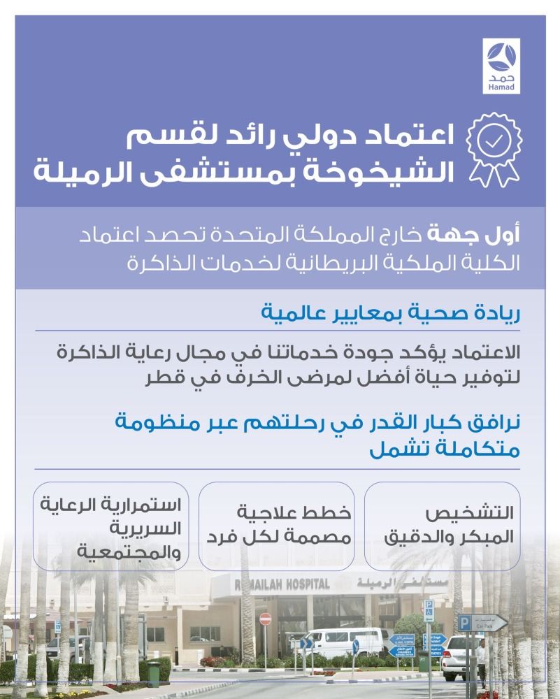 حصل مستشفى الرميلة، التابع لمؤسسة حمد الطبية، على اعتماد الكلية الملكية البريطانية لخدمات الذاكرة، كأول مركز في العالم يحقق هذا الإنجاز خارج المملكة المتحدة.
