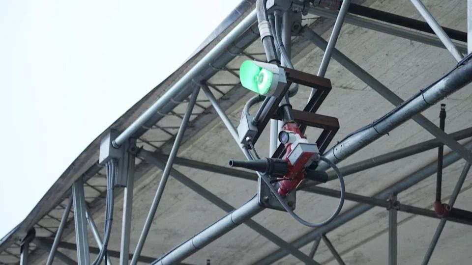 Part of the Fire Rover fire suppression system meant to detect and put out small fires started in piles of recycling caused by things like exploding batteries at the GFL Environmental Inc. materials recycling facility in Richmond, B.C. (Ryan McLeod/CBC)