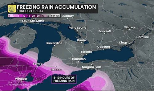 A prolonged period of freezing rain, as much as 5 to 10 hours, is in the forecast in southwestern Ontario around Windsor and Chatham.