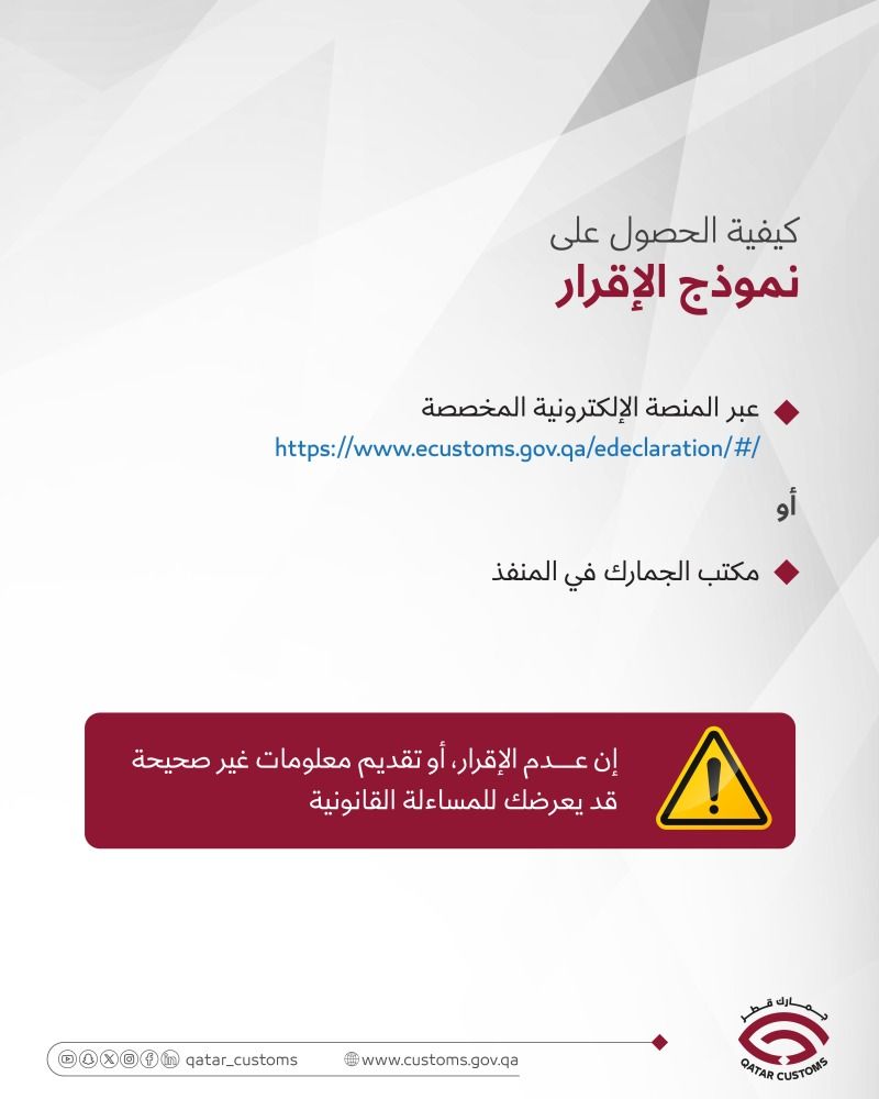 نبّهت الهيئة العامة للجمارك بأهمية الإقرار الجمركي للمسافرين من قطر والقادمين إليها والحالات التي تستلزم تعبئته وعقوبة الامتناع عن ذلك أو تقديم معلومات خاطئة.