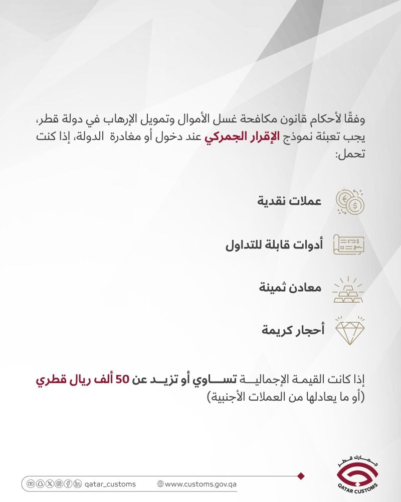 وذكّرت الهيئة العامة للجمارك عبر حسابها بمنصة "إكس"، أمس الأربعاء، بأبرز الإرشادات وكيفية الحصول على تعبئة نموذج الإقرار الجمركي عند السفر، مشددة على أنه وفقاً لأحكام قانون مكافحة غسل الأموال وتمويل الإرهاب في دولة قطر يجب تعبئة نموذج الإقرار الجمركي عند دخول أو مغادرة الدولة، إذا كنت تحمل: