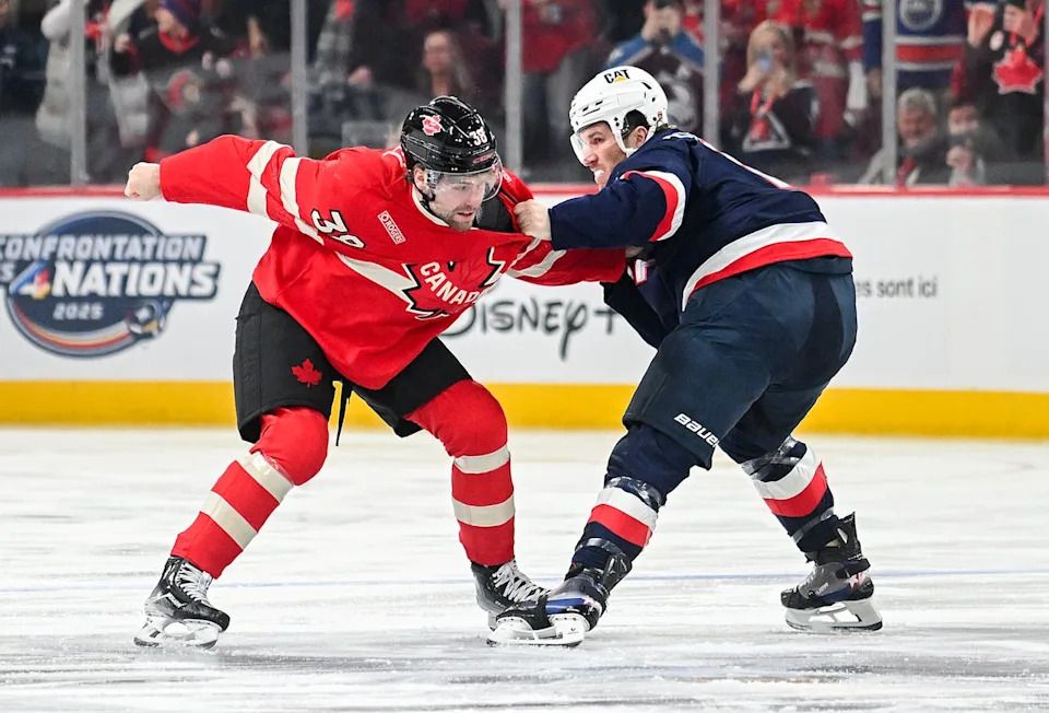 Canada's Brandon Hagel fights with United States' Matthew Tkachuk during the 4 Nations Face-Off hockey tournament in Montreal. (Graham Hughes/The Canadian Press)