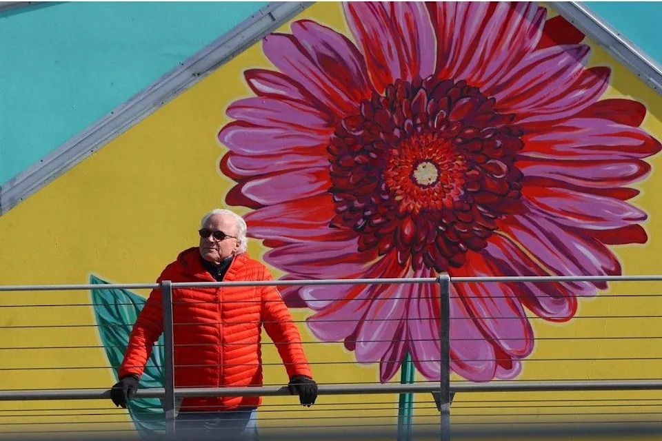 Bjorn Nilsen paused on Olympic Way S.E. to look at recent changes in the area and the Calgary skyline on March 18, 2025. He lived in Calgary for 30 years, but has come back from B.C. to visit friends.